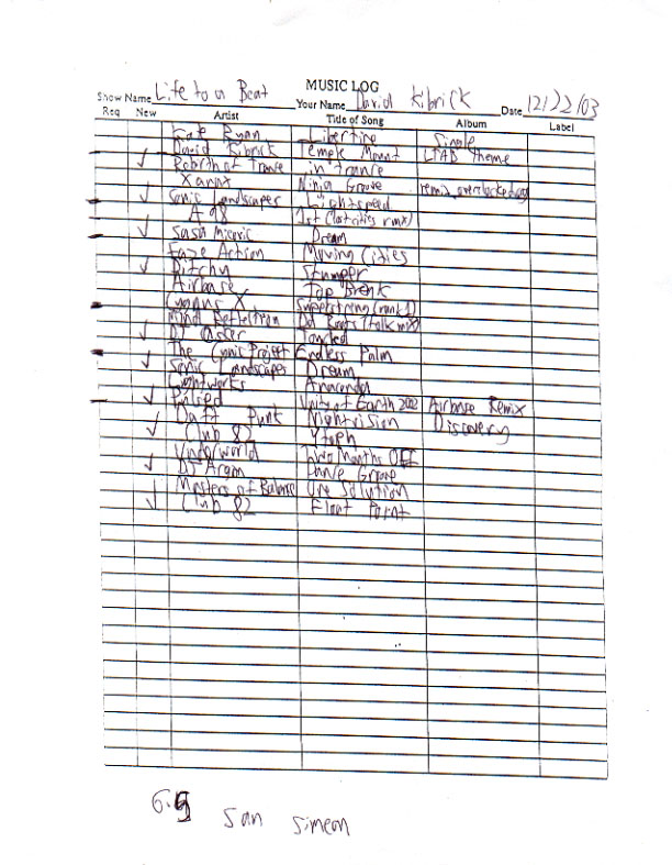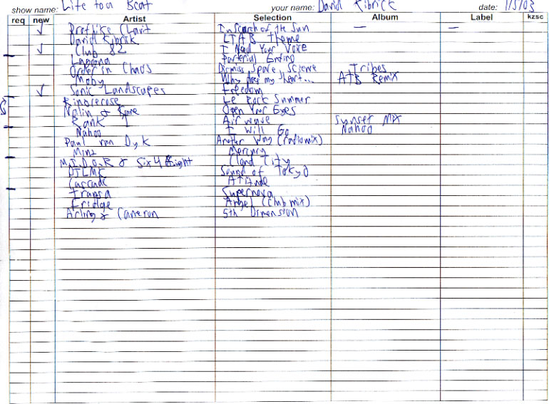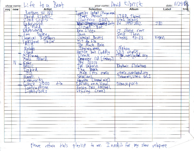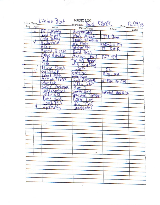 These are the actual show playlists, taken directly from what I bring in to organize the shows. Aside from requests, these represent everything that has been played on Life to a Beat. These archives only go back to 4/22, the fourth LTAB show, as the first few shows were pretty much on-the-fly, and I don't have any written records of what was played. All other missing shows were also composed on the fly in the studio, and I'm currently waiting to get the pen-and-paper playlists back from those shows so that I can enter them.